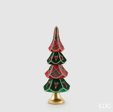 Elegante albero di Natale decorativo realizzato in tessuto, caratterizzato da raffinati strati sovrapposti in fantasia scozzese e velluto verde. I profili dorati e i piccoli dettagli decorativi con bacche rosse donano profondità e ricchezza visiva, creando un perfetto equilibrio tra tradizione e raffinatezza.