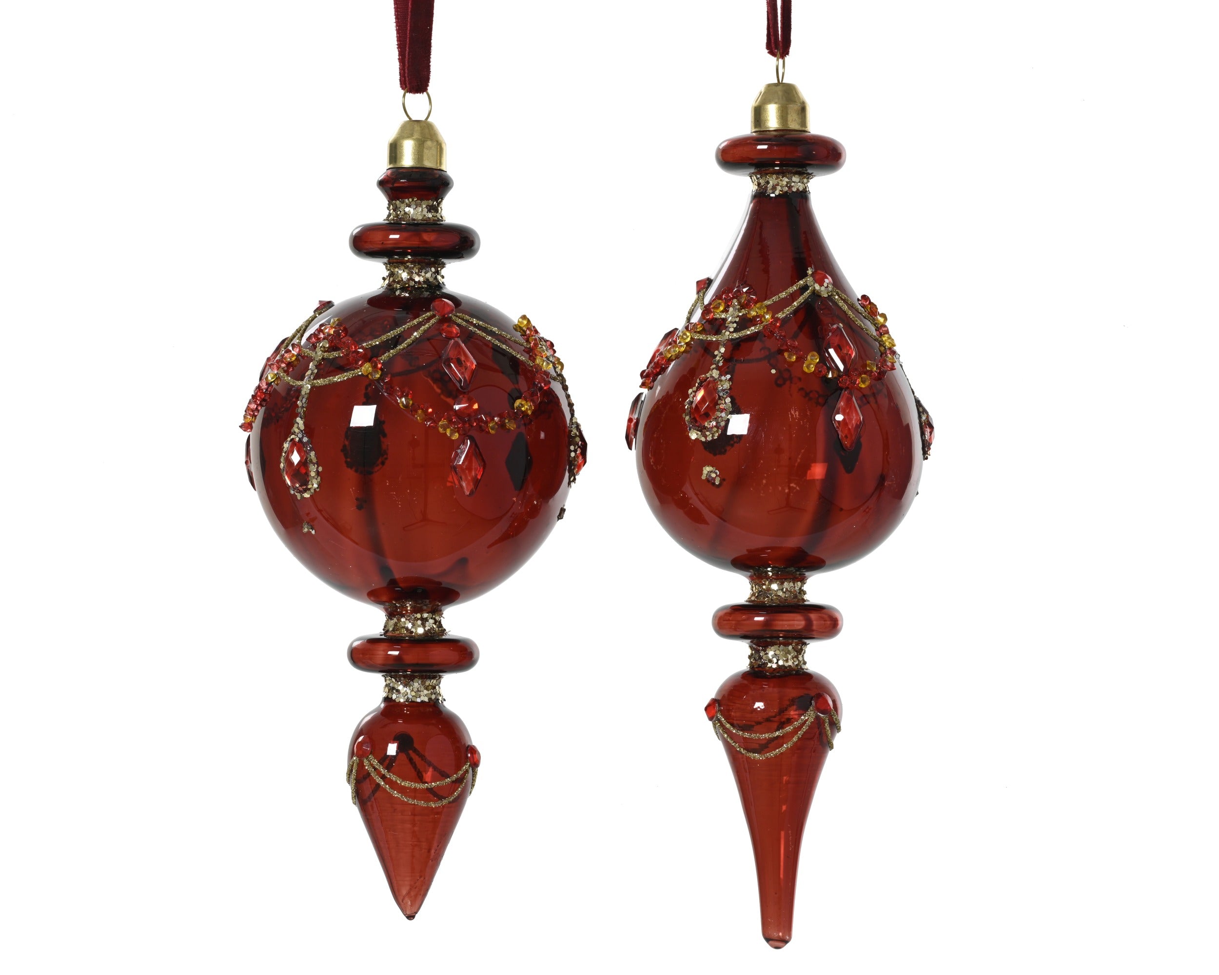 🎄❤️ Set 2 Decorazioni Natalizie “Ruby Jewel” – Vetro Rosso con Dettagli Gioiello e Glitter Oro ✨💎