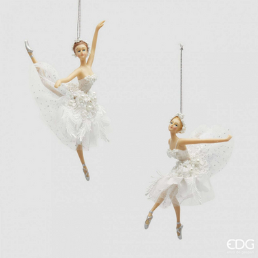 Raffinata decorazione natalizia a forma di ballerina, realizzata con linee armoniose e abito bianco impreziosito da dettagli delicati e luminosi. La posa aggraziata e il design etereo evocano leggerezza, eleganza e atmosfera da fiaba, rendendo questo soggetto perfetto per decorazioni natalizie sofisticate.