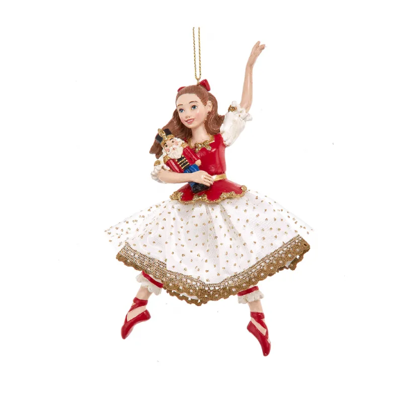 Un omaggio incantevole al classico balletto natalizio “Lo Schiaccianoci”, questa decorazione raffigura una dolce ballerina che stringe tra le braccia il suo piccolo schiaccianoci, pronta a danzare nella magia delle feste.