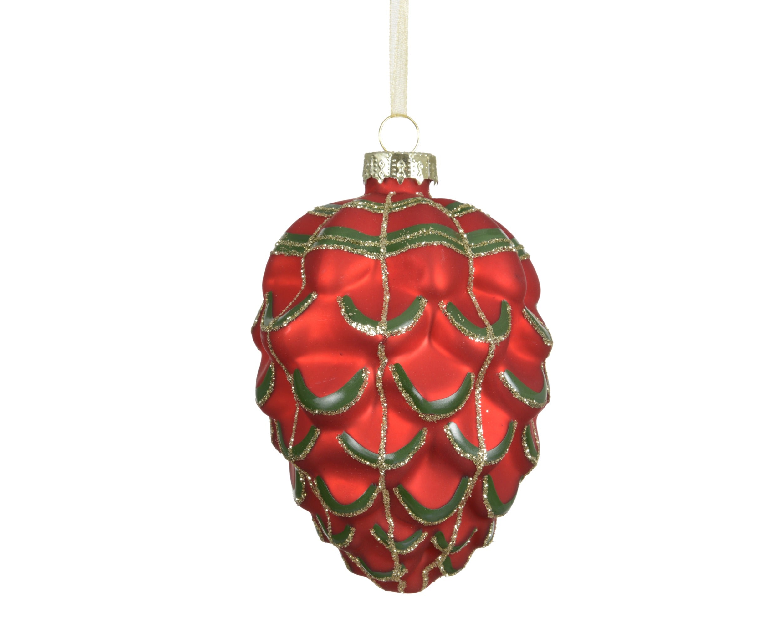 🎄 Decorazione Natalizia in Vetro – Pigna Rosso Opaco con Dettagli Oro & Verde 🎄