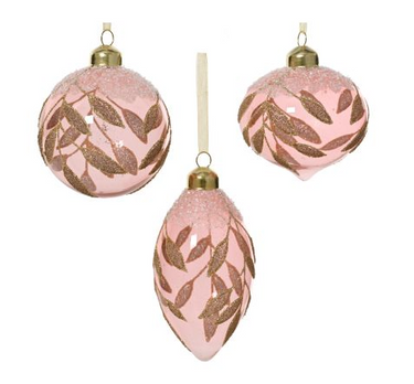 Delicato set di palline natalizie in vetro decorativo, caratterizzato da raffinate tonalità rosa cipria e impreziosito da eleganti motivi fogliari in glitter oro. Le diverse forme donano movimento e armonia all’albero, creando un effetto luminoso e sofisticato.