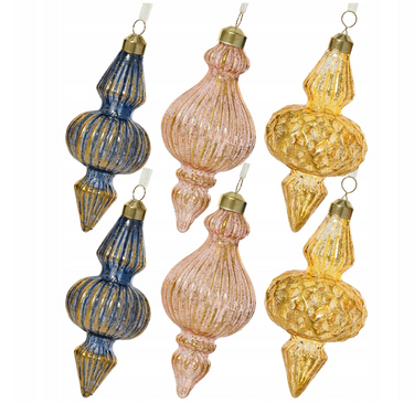 Raffinato set di decorazioni natalizie in vetro soffiato, caratterizzato da forme allungate e sinuose ispirate allo stile classico. Le superfici rigate e leggermente martellate sono impreziosite da delicati riflessi glitter oro, che esaltano le tonalità blu, rosa cipria e ambra per un effetto luminoso e ricercato.
