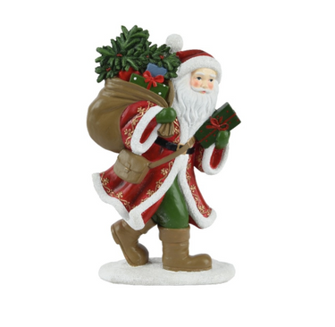 Una statua decorativa ricca di dettagli che racconta tutta la magia del Natale. Babbo Natale è raffigurato in cammino, con il suo sacco colmo di doni sulle spalle e un regalo tra le mani, pronto a portare gioia e sorpresa. I colori caldi e le finiture curate rendono questa decorazione un classico intramontabile.