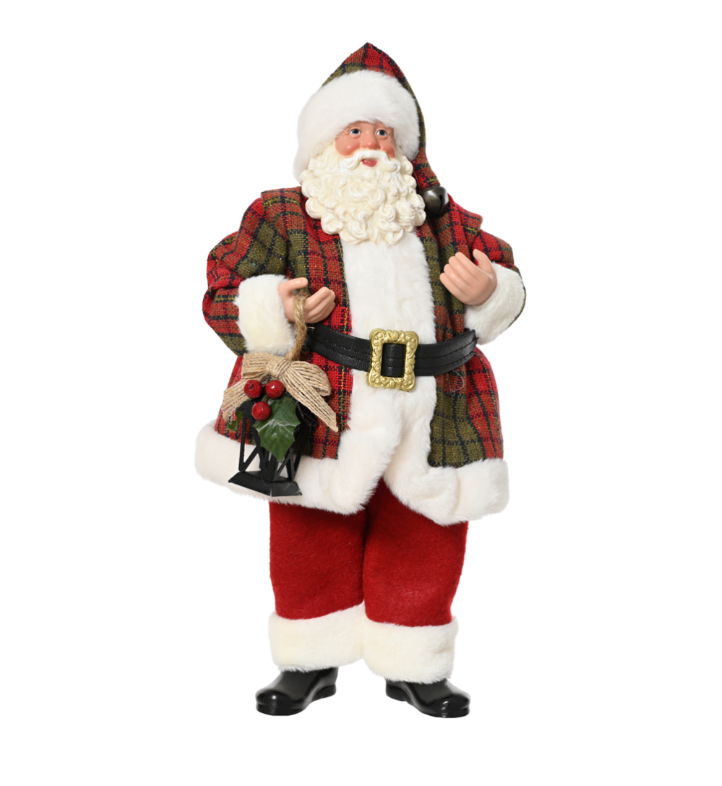 Una splendida statua decorativa che racchiude tutto il calore e la tradizione del Natale classico. Babbo Natale è raffigurato in piedi, con un elegante cappotto in tessuto tartan, dettagli in pelliccia bianca e una lanterna decorativa che richiama le atmosfere natalizie di una volta.