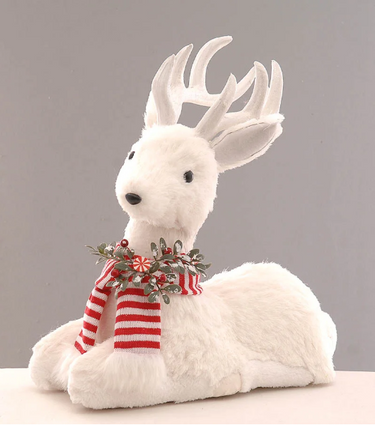 Un’elegante decorazione natalizia che porta con sé tutta la magia e la serenità del Natale. Questa splendida renna bianca, seduta con grazia, è avvolta in una morbida pelliccia sintetica e indossa una scarf rossa e bianca a righe con una piccola ghirlanda decorativa attorno al collo.