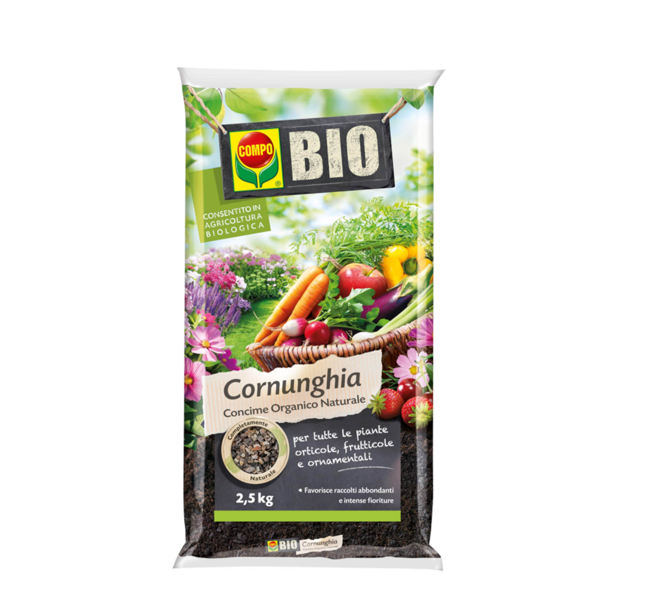 COMPO Bio Cornunghia è un concime organico azotato utilizzato fin dai tempi antichi in campo agricolo. Ideale per la concimazione di fondo del terreno: l'alta percentuale di azoto organico assicura un costante rilascio di sostanza nutritiva che sostiene la coltivazione durante tutto il ciclo vegetativo; il carbonio organico favorisce la flora batterica, la formazione di humus fertile e di conseguenza la struttura e porosità del terreno. Impiegabile alla semina o trapianto delle colture orticole, migliorandone forma, colore e gusto. Ideale anche per ornamentali, poiché aiuta la fissazione del colore nei fiori.