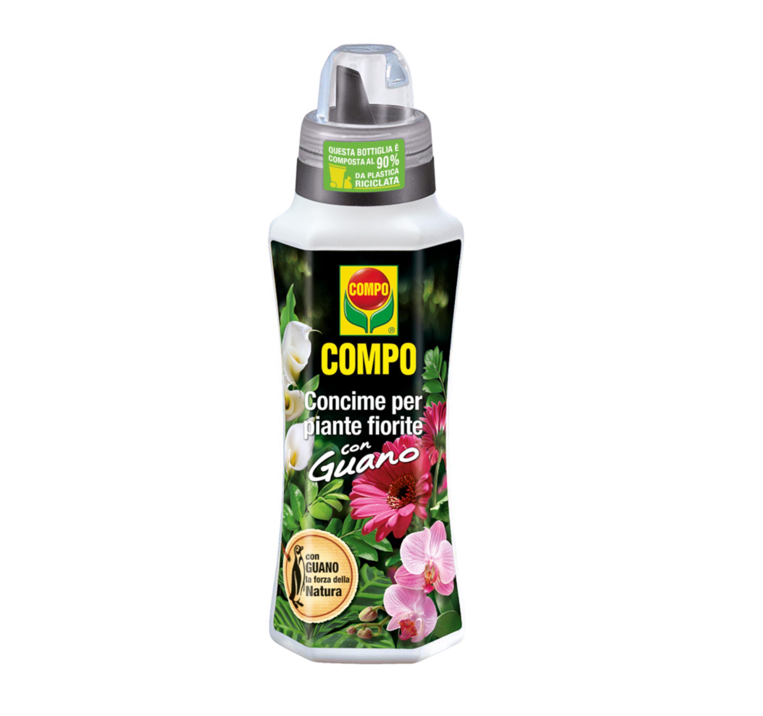 Concime liquido organo-minerale COMPO specifico a base di Guano. Le piante fiorite sono infatti sensibili alla salinità e prediligono una concimazione organica. Le sostanze nutritive contenute nel Guano nutrono delicatamente le piante favorendone uno sviluppo rigoglioso e strabilianti fioriture.