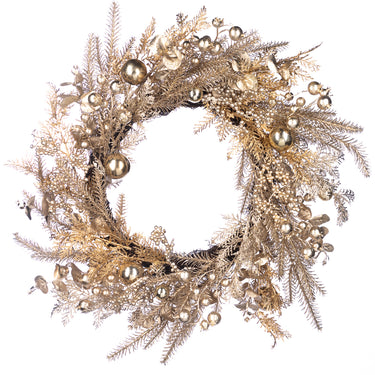 Un’elegante ghirlanda dorata che dona luce e raffinatezza alle decorazioni natalizie. Realizzata con rami in oro, bacche brillanti, sfere decorative e dettagli naturali, è perfetta per impreziosire porte, pareti o tavoli durante le feste.