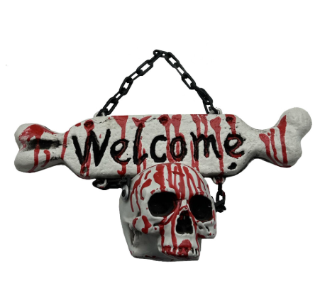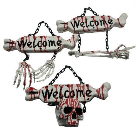 Insegna a forma di osso con scritta “Welcome” insanguinata