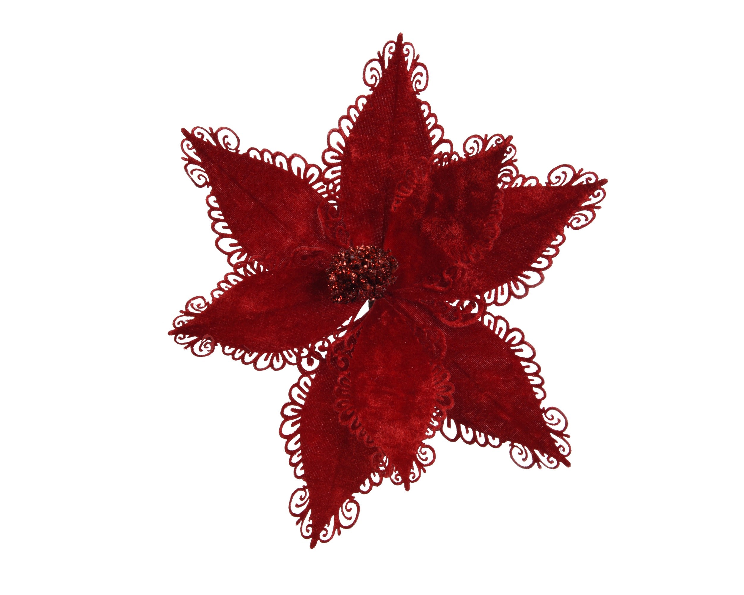 Questa magnifica stella di Natale è realizzata in velluto rosso intenso, morbido e ricco alla vista, con un esclusivo bordo ricamato ornamentale, che crea un effetto sofisticato e romantico.