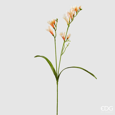 Raffinato ramo di fresia artificiale con fiori nei delicati toni crema-pesca, realizzati con cura per riprodurre fedelmente la leggerezza e l’eleganza del fiore naturale. Le corolle slanciate e le foglie verdi sottili donano armonia e realismo, creando una decorazione sofisticata e luminosa.