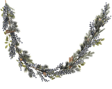 Una ghirlanda elegante e originale che unisce il verde intenso delle fronde invernali con dettagli raffinati come bacche blu ghiacciate, foglioline verdi, pigne naturali e bastoncini di cannella. L’effetto leggermente innevato la rende perfetta per dare un tocco sofisticato e accogliente agli ambienti natalizi.