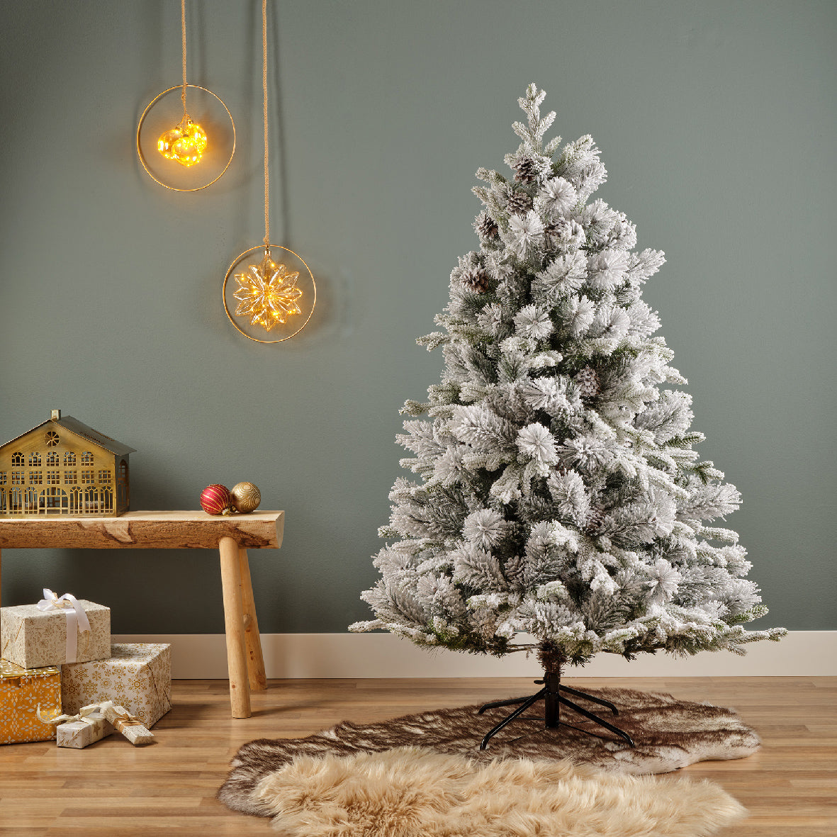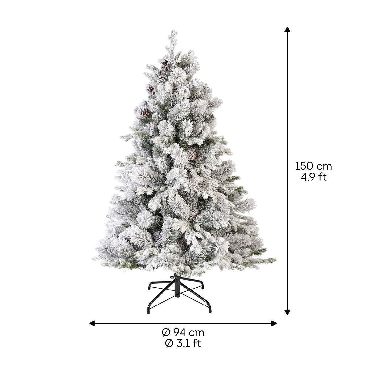 Un albero elegante e realistico, caratterizzato da un effetto neve soffice che richiama i paesaggi invernali. Le pigne decorative sparse tra i rami completano l’aspetto naturale, rendendolo perfetto come protagonista delle tue festività.