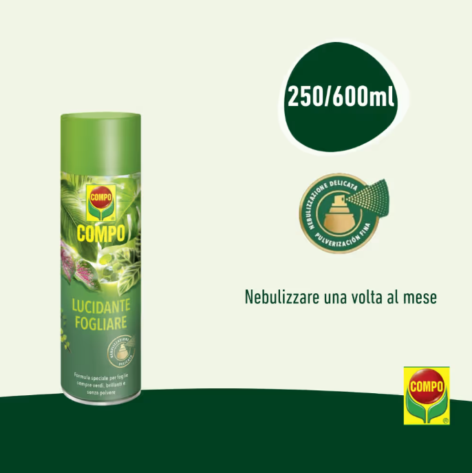 COMPO Lucidante fogliare, spruzzato sulle piante ornamentali, conferisce per un lungo periodo di tempo una brillante colorazione verde e lucentezza alle foglie. Elimina la polvere e le macchie di acqua calcarea o ferrosa, migliora così la fotosintesi e la respirazione delle piante, favorendone una crescita sana.