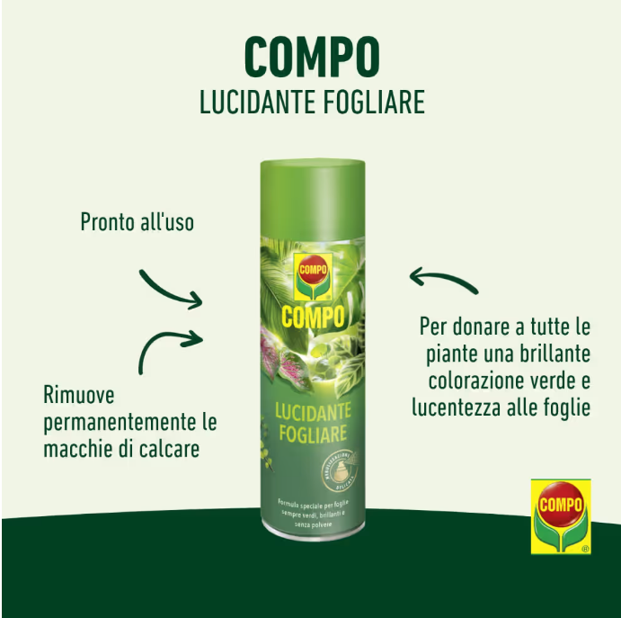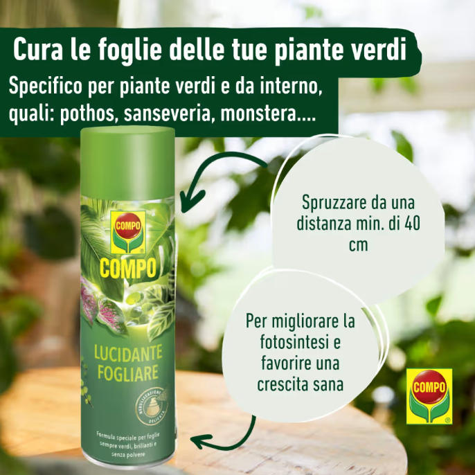 COMPO Lucidante fogliare, spruzzato sulle piante ornamentali, conferisce per un lungo periodo di tempo una brillante colorazione verde e lucentezza alle foglie. Elimina la polvere e le macchie di acqua calcarea o ferrosa, migliora così la fotosintesi e la respirazione delle piante, favorendone una crescita sana.
