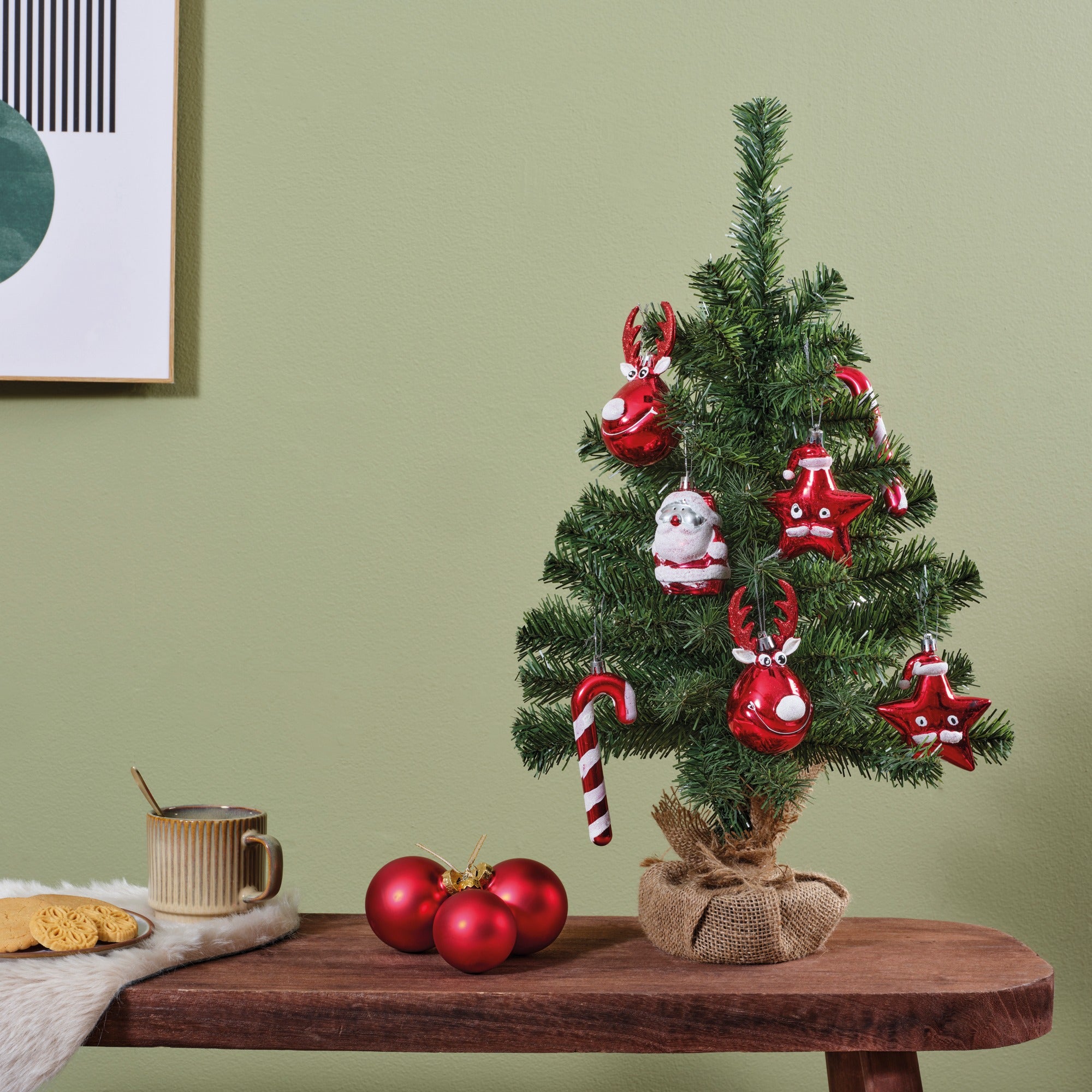 Un piccolo albero di Natale già decorato, perfetto per tavoli, scrivanie o piccoli spazi. Le sue decorazioni rosse con stelle, renne, bastoncini di zucchero e Babbo Natale creano subito un’atmosfera festosa e allegra.