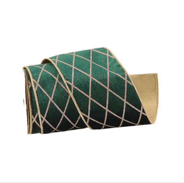 Un nastro sofisticato e senza tempo, perfetto per aggiungere un tocco di raffinatezza e luminosità alle tue decorazioni natalizie. Il design a reticolo dorato su fondo verde smeraldo lo rende ideale per decorazioni eleganti e armoniose.