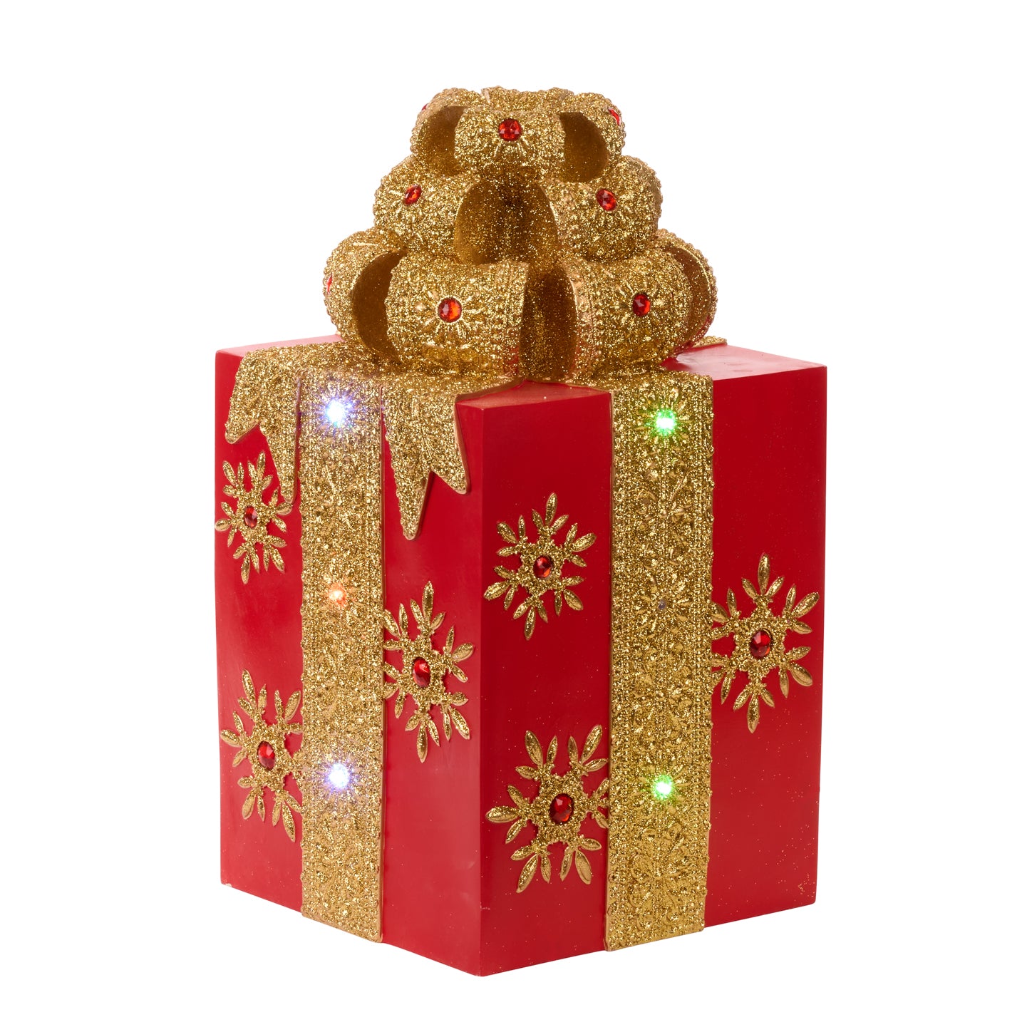 Un’elegante decorazione natalizia a forma di pacco regalo rosso, impreziosito da dettagli glitterati dorati e fiocco scintillante. Le luci LED multicolore integrate donano un effetto brillante e festoso, perfetto per ravvivare ogni angolo della casa.