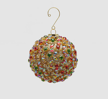 Raffinata sfera decorativa natalizia dall’effetto gioiello, interamente rivestita da cristalli e applicazioni multicolor che riflettono la luce creando preziosi giochi cromatici. La base dorata e la superficie ricca di dettagli rendono questo ornamento scenografico, elegante e di grande impatto visivo.