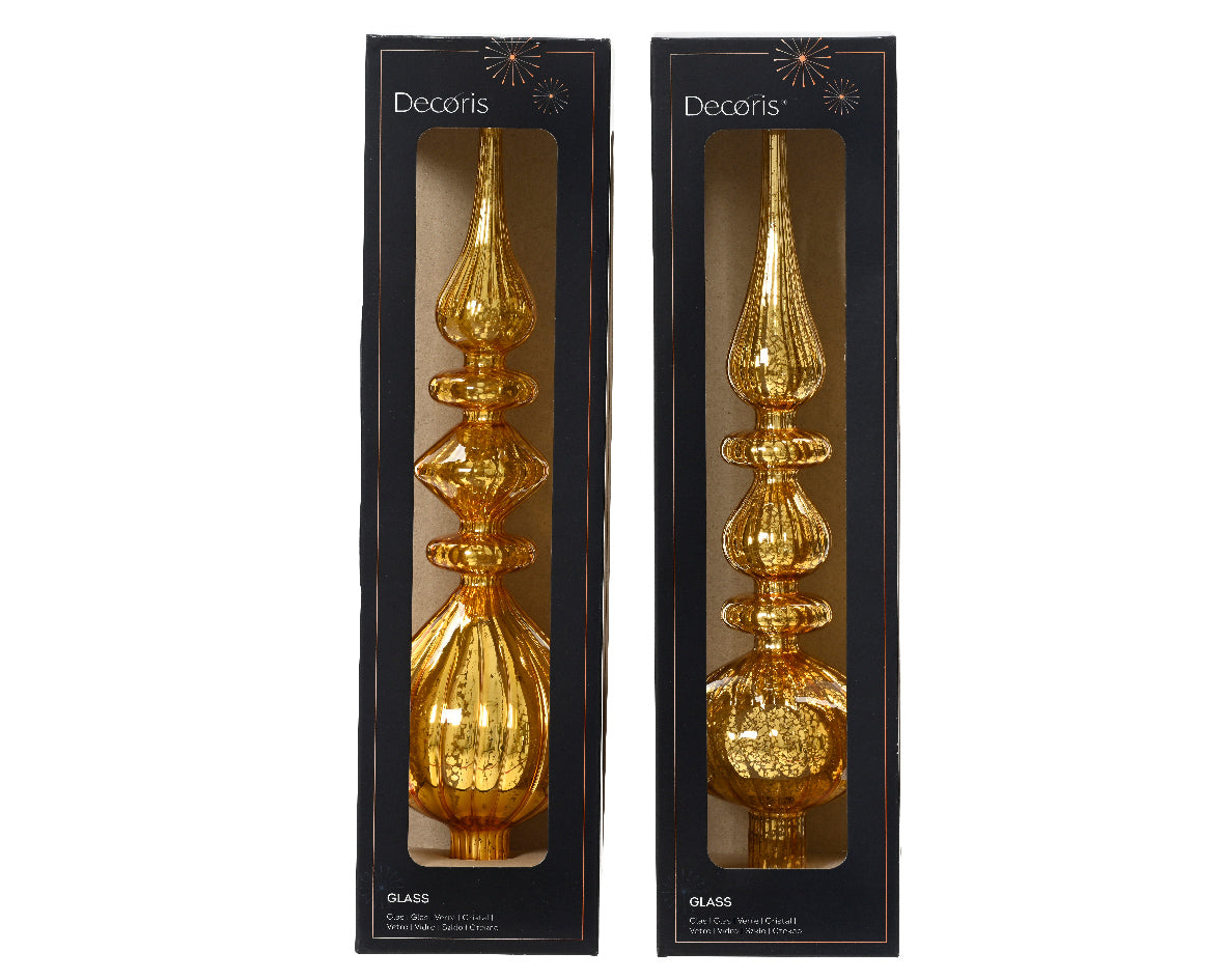 Rendi il tuo albero ancora più luminoso con questo set di 2 puntali dorati dallo stile elegante e raffinato. Caratterizzati da forme slanciate e lavorazioni decorative, sono perfetti per aggiungere un tocco di lusso e brillantezza alle tue feste.