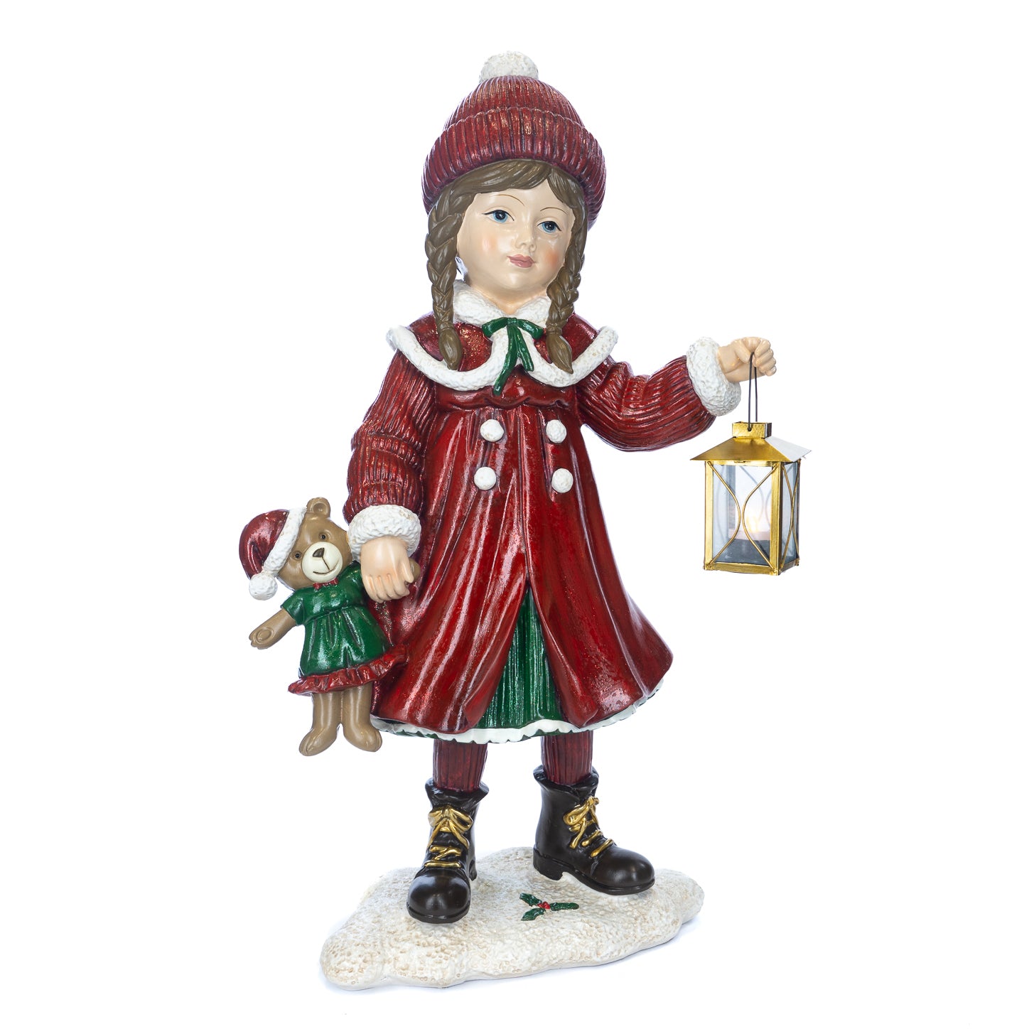 Un’elegante statuina che raffigura una dolce bambina in abito natalizio rosso e verde, con cappellino e stivali invernali. In una mano tiene una lanterna dorata, simbolo di luce e speranza, mentre nell’altra porta con sé un tenero orsetto vestito per le feste.