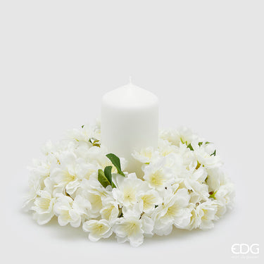 Delicata corona decorativa realizzata con numerosi piccoli fiori bianchi dall’aspetto estremamente realistico, perfettamente disposti per creare una composizione armoniosa ed elegante. Ideale per valorizzare candele decorative, dona un tocco romantico e luminoso a qualsiasi ambiente.
