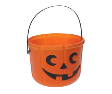 Un classico immancabile per il dolcetto o scherzetto! Realizzato in plastica arancione con faccina sorridente nera in stile jack-oβ-lantern, dotato di manico per portarlo facilmente in giro.