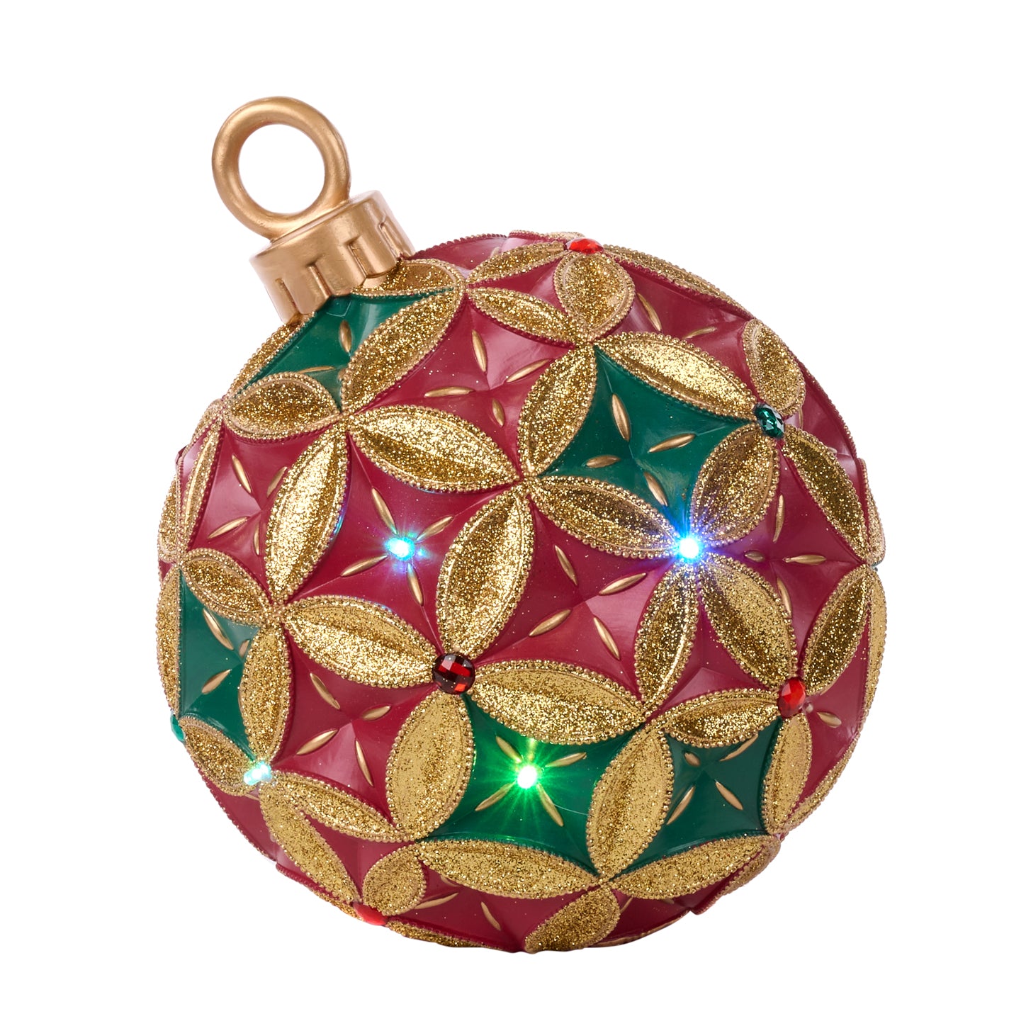 Una decorazione natalizia scenografica a forma di grande palla, caratterizzata da un elegante motivo geometrico rosso e verde con dettagli dorati glitterati. Le piccole luci LED integrate (blu, verde, rosso) aggiungono un effetto luminoso che rende l’atmosfera calda e festosa.