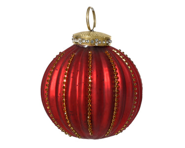 Una decorazione di grande fascino, perfetta per impreziosire il tuo albero di Natale. Questa pallina rossa in vetro satinato presenta eleganti righe verticali arricchite da micro perline dorate, mentre il tappo superiore è rifinito con brillanti strass che donano un tocco di luce e raffinatezza.