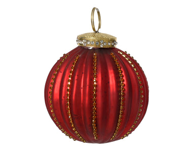 Una decorazione di grande fascino, perfetta per impreziosire il tuo albero di Natale. Questa pallina rossa in vetro satinato presenta eleganti righe verticali arricchite da micro perline dorate, mentre il tappo superiore è rifinito con brillanti strass che donano un tocco di luce e raffinatezza.