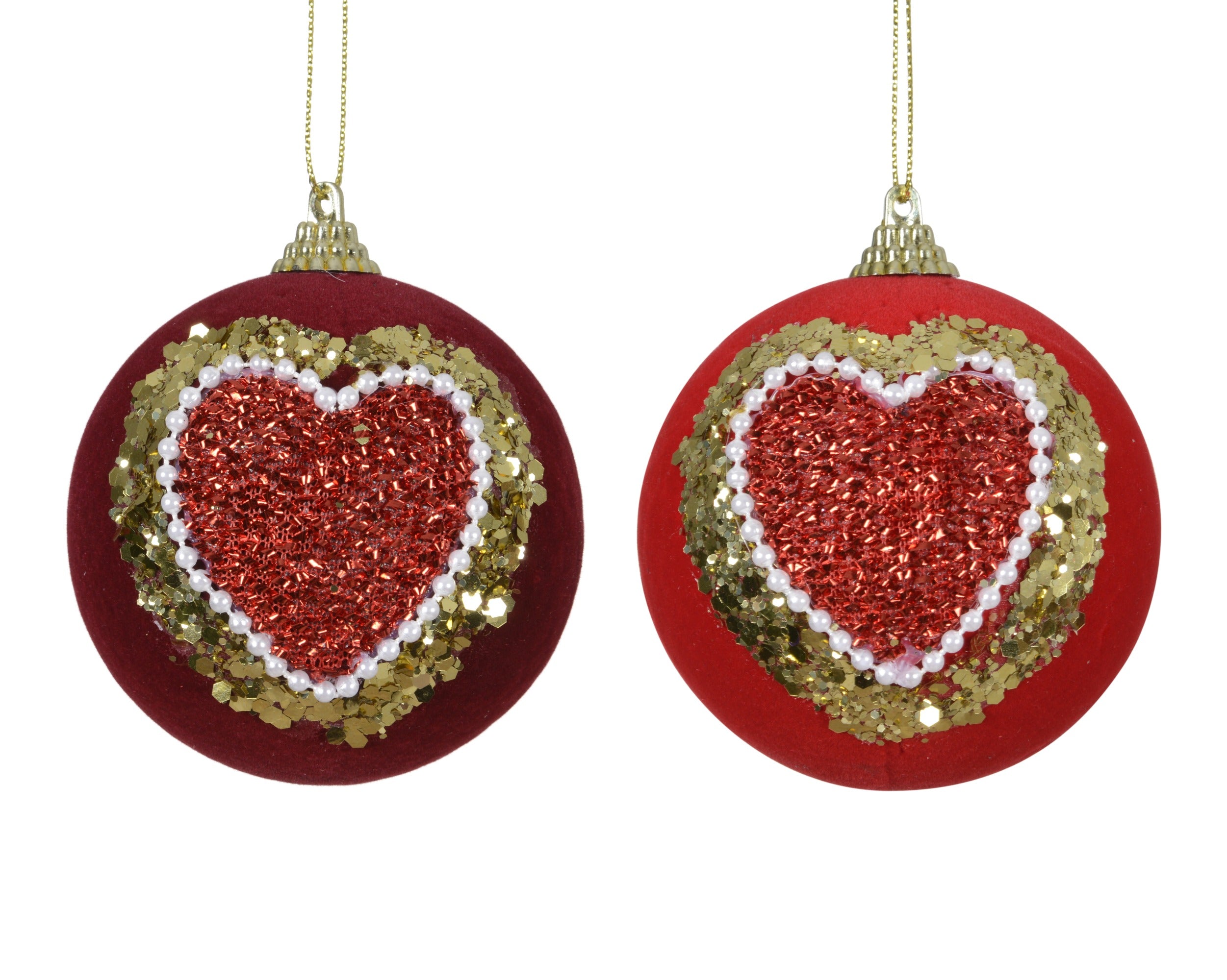 Ogni pallina presenta al centro un cuore rosso scintillante, contornato da un’elegante fila di perline bianche. Attorno al cuore, un generoso strato di paillettes dorate crea un effetto luminoso e prezioso, perfetto per attirare lo sguardo.