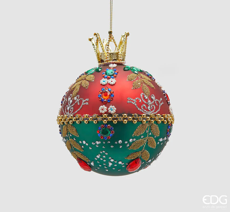 Raffinata sfera decorativa natalizia dal design regale, impreziosita da una corona dorata superiore e da una ricca decorazione gioiello. La superficie è suddivisa in eleganti campiture rosse e verdi, arricchite da applicazioni luminose, motivi dorati e dettagli brillanti che donano un effetto prezioso e scenografico.