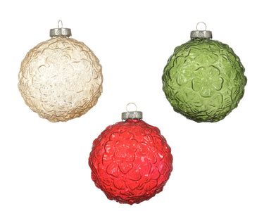 Un trio di decorazioni dal fascino elegante e senza tempo: queste palline in vetro con motivo floreale in rilievo aggiungono profondità, luce e un tocco prezioso al tuo albero di Natale.
