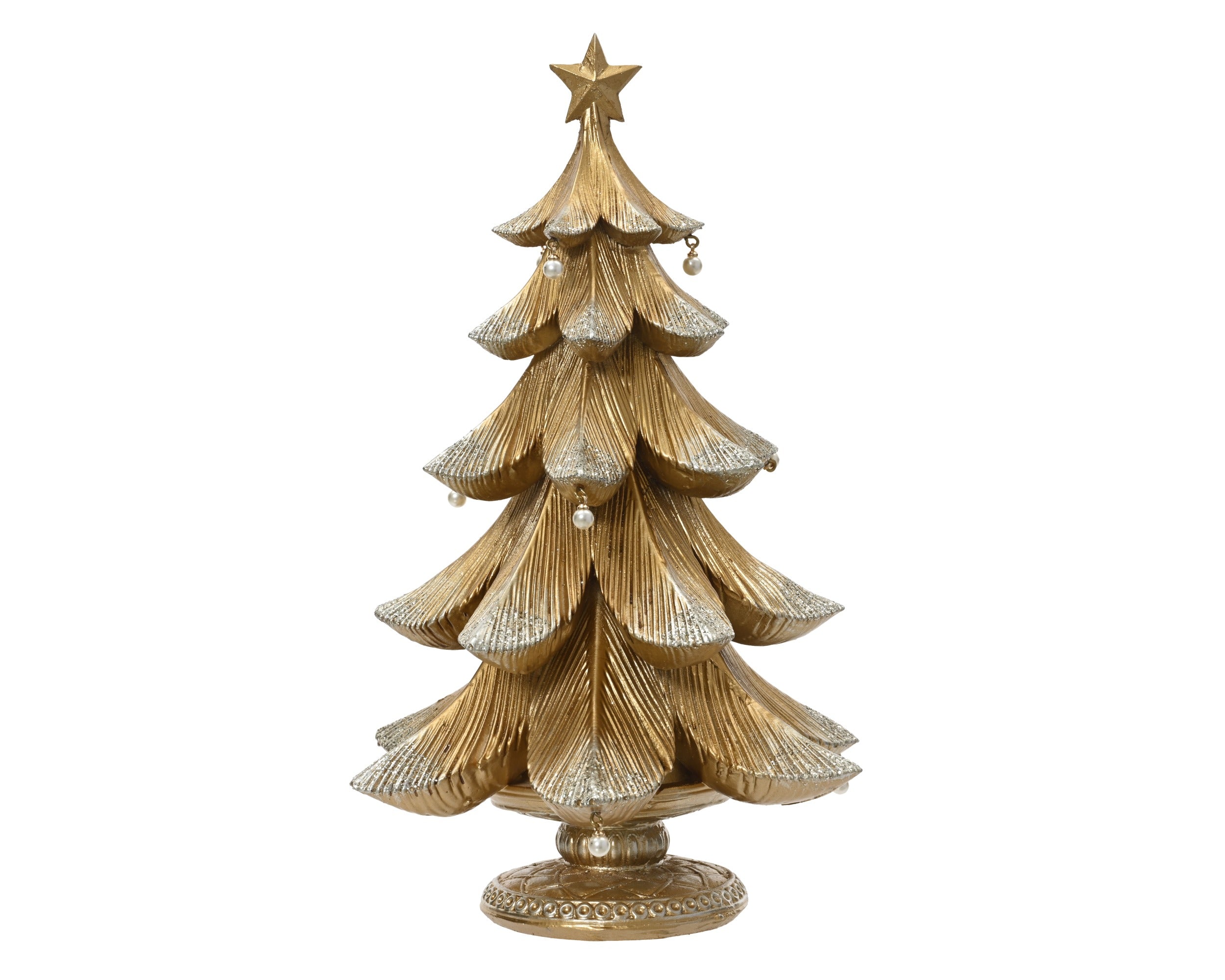Un raffinato albero decorativo in finitura oro satinato, impreziosito da dettagli perlati e lievi tocchi glitterati. Una decorazione scenografica e di grande classe, perfetta per valorizzare ambienti sofisticati e creare un’atmosfera natalizia calda e luminosa.