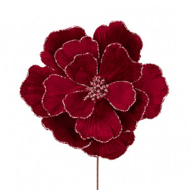 Un’elegante decorazione floreale perfetta per arricchire alberi, ghirlande e centrotavola natalizi. I petali in velluto rosso intenso sono rifiniti da dettagli glitterati che donano luminosità e raffinatezza.