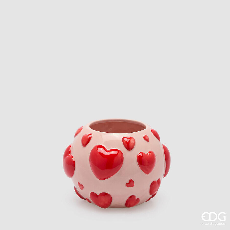 Originale coprivaso in ceramica caratterizzato da un elegante fondo rosa decorato con cuori rossi in rilievo. La finitura lucida e il design romantico lo rendono perfetto per arricchire qualsiasi ambiente con un tocco dolce e decorativo.